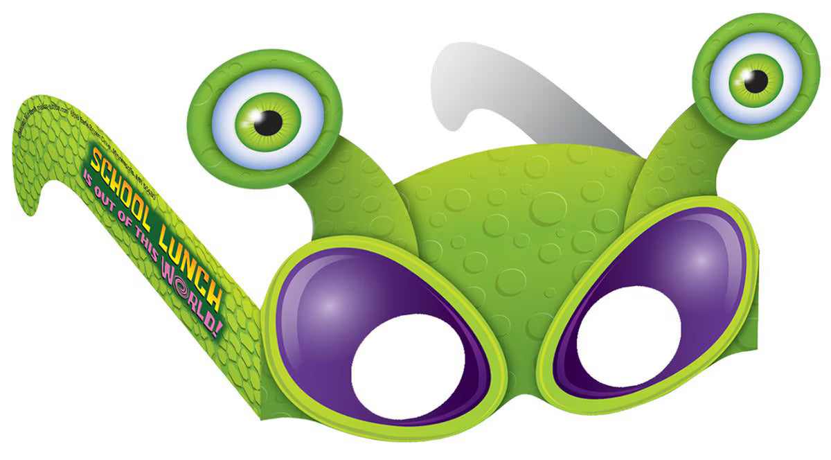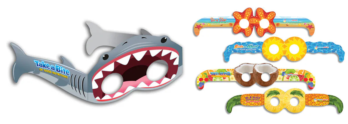 Students love these metallic gamified silly glasses! Fun for imaginative play, while reinforcing the simple message of eating healthy school lunches. Made from heavy paper stock in the USA. For ages 3+.